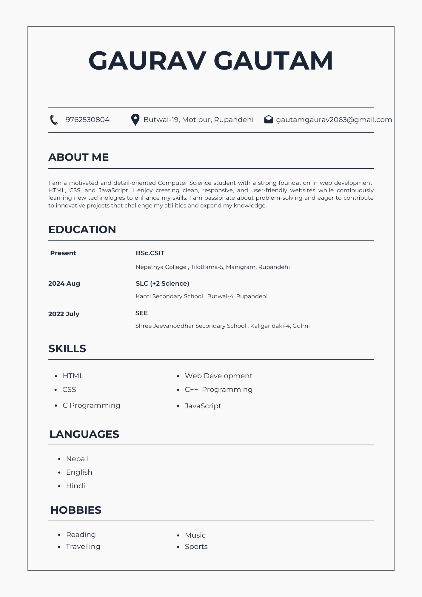 I'm currently pursuing my BSc in Computer Science and Information Technology in Nepal, where I've developed a strong foundation in software development and problem-solving. My journey in tech is driven by curiosity and a genuine passion for creating solutions that make a difference.